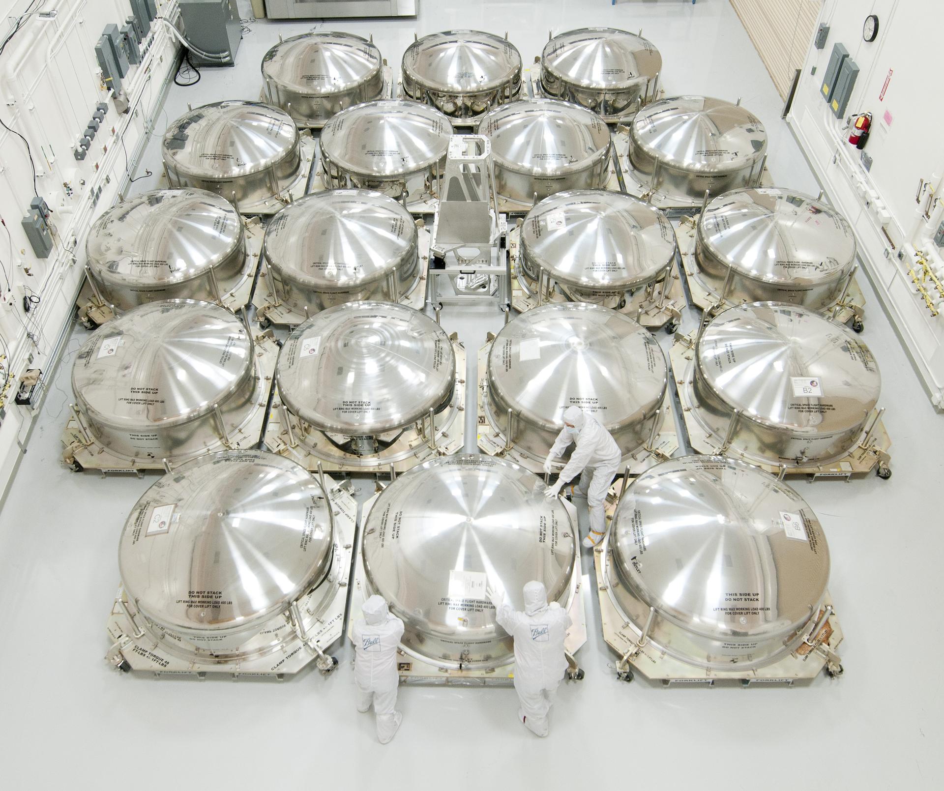The powerful primary mirrors of the James Webb Space Telescope will be able to detect the light from distant galaxies. The manufacturer of those mirrors, Ball Aerospace & Technologies Corp. of Boulder, Colo., recently celebrated their successful efforts as mirror segments were packed up in special shipping canisters (cans) for shipping to NASA. The Webb telescope has 21 mirrors, with 18 primary mirror segments working together as one large 21.3-foot (6.5-meter) primary mirror. The mirror segments are made of beryllium, which was selected for its stiffness, light weight and stability at cryogenic temperatures. Bare beryllium is not very reflective of near-infrared light, so each mirror is coated with about 0.12 ounce of gold. Northrop Grumman Corp. Aerospace Systems is the principal contractor on the telescope and commissioned Ball for the optics system's development, design, manufacturing, integration and testing. The Webb telescope is the world's next-generation space observatory and successor to the Hubble Space Telescope. The most powerful space telescope ever built, the Webb telescope will provide images of the first galaxies ever formed, and explore planets around distant stars. It is a joint project of NASA, the European Space Agency and the Canadian Space Agency. For more information about the James Webb Space Telescope, visit: <a href="http://www.jwst.nasa.gov" rel="nofollow">www.jwst.nasa.gov</a> Credit: Ball Aerospace <b><a href="http://www.nasa.gov/audience/formedia/features/MP_Photo_Guidelines.html" rel="nofollow">NASA image use policy.</a></b> <b><a href="http://www.nasa.gov/centers/goddard/home/index.html" rel="nofollow">NASA Goddard Space Flight Center</a></b> enables NASA’s mission through four scientific endeavors: Earth Science, Heliophysics, Solar System Exploration, and Astrophysics. Goddard plays a leading role in NASA’s accomplishments by contributing compelling scientific knowledge to advance the Agency’s mission. <b>Follow us on <a href="http://twitter.com/NASA_GoddardPix" rel="nofollow">Twitter</a></b> <b>Like us on <a href="http://www.facebook.com/pages/Greenbelt-MD/NASA-Goddard/395013845897?ref=tsd" rel="nofollow">Facebook</a></b> <b>Find us on <a href="http://instagrid.me/nasagoddard/?vm=grid" rel="nofollow">Instagram</a></b>